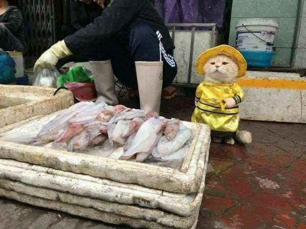 ▼Chó很勤勞,不像其他貓咪一樣,整天待在家裡等著主人餵食。牠每天都會穿得整整齊齊,跟著主人到市場擺攤。