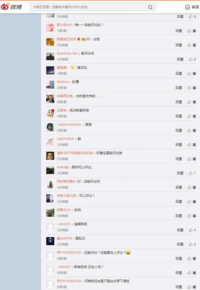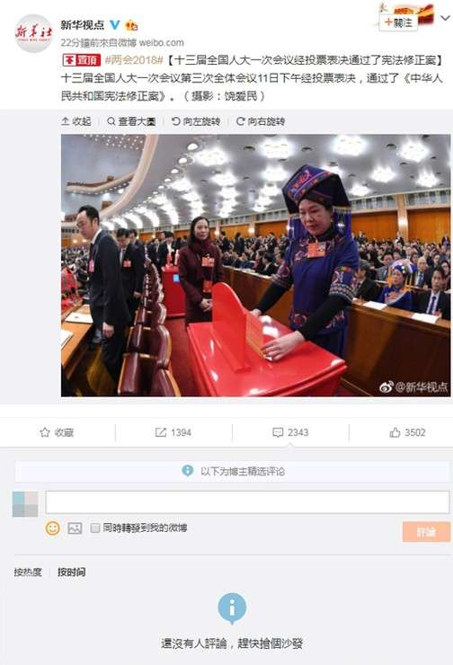 ▼原本《河南新聞廣播》的微博沒有禁止留言,讓許多網友湧入表示這是「國恥日」、「中國危矣」、「都有臉做害怕人說」、「這群廢物上去代表什麼玩意」,也有人擔憂「河南電視台的台長是不是想下台了?」果然過了不久,河南新聞廣播就刪除了這篇新聞,重新發表了一次修憲結果的新聞,不過這一次留言功能確定被封鎖了。
