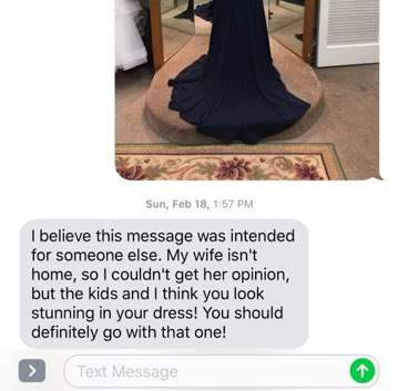 2018年03月12日一名叫做Syd的年輕女子想詢問朋友對於衣著上的意見,於是拍著照片傳簡訊給她的閨蜜,沒想到意外傳到了育有6個孩子的爸爸手上,於是Syd得到了超可愛的回應。