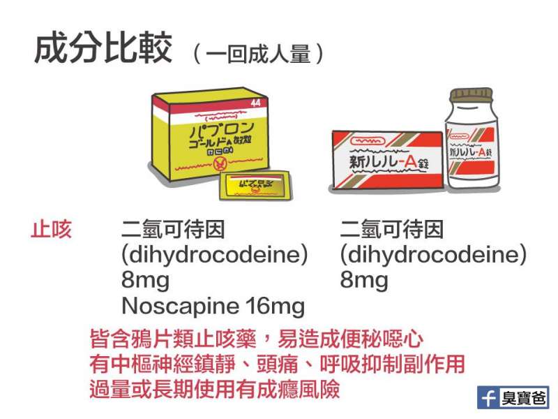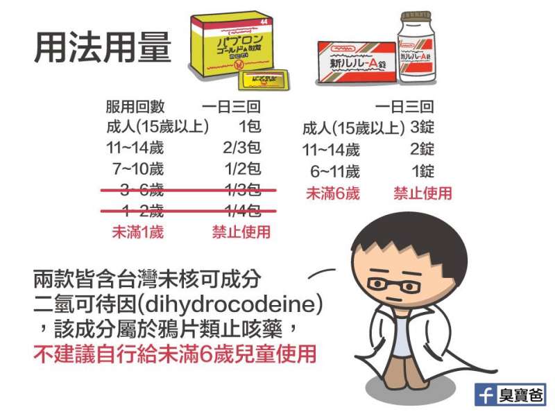 ▼他指出因為這2款藥物皆含有台灣未核可的「二氫可待因」(Dihydrocodeine)成分,這是一種鴉片類止咳藥,因此不建議給未滿6歲的兒童使用。