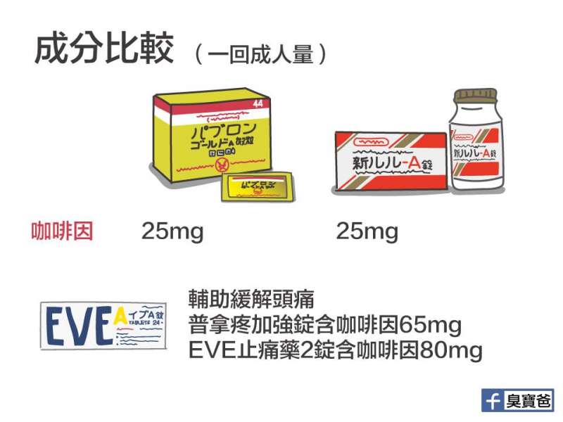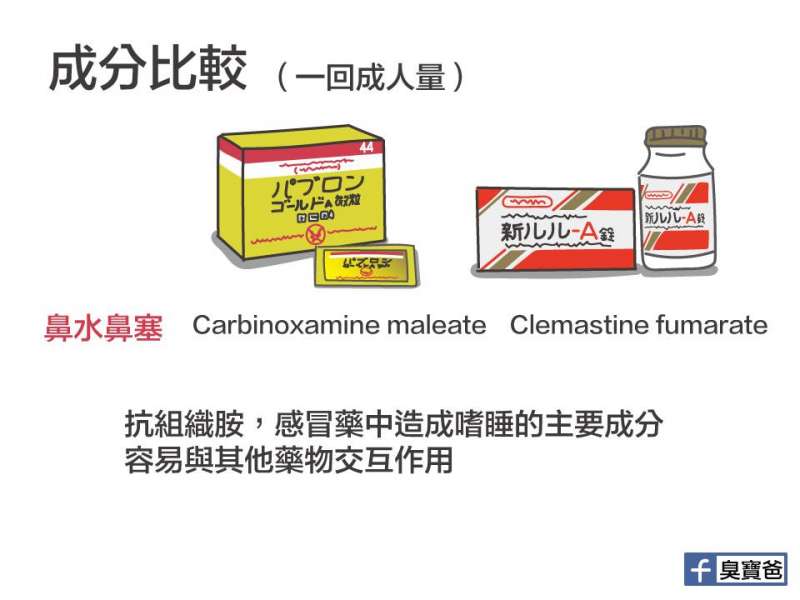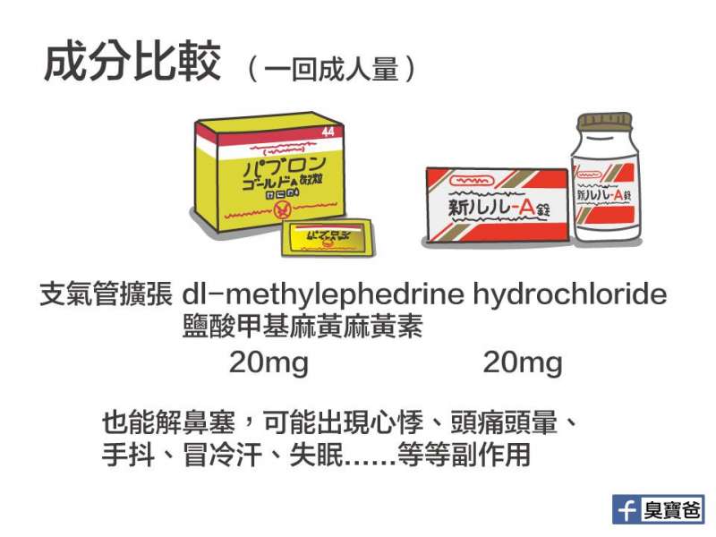 ▼接著是藥物其他成分的比較(一回成人量),列出各種可能會帶來的後遺症,大家一起來看看吧。
