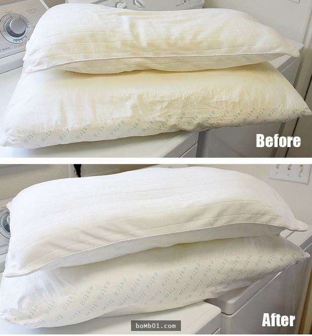 ▼17. 枕頭變黃該怎麼辦?將洗衣粉、清潔劑、漂白水加入枕頭內,清洗便可~