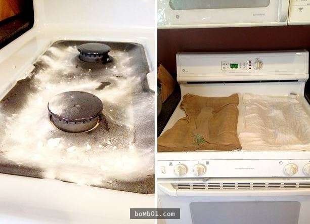 ▼9. 瓦斯爐灶髒兮兮?把小蘇打粉全部鋪在上方,靜置一段時間後便可清洗乾淨!