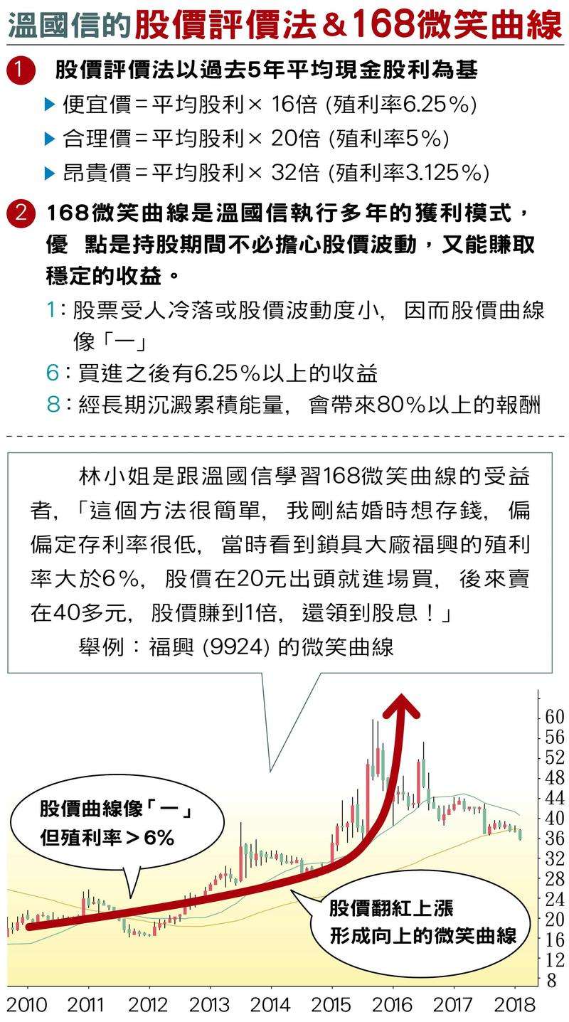 目前溫國信定期追蹤的「倉儲股」約有100檔,這其中包括裕融、台汽電、兆豐金等。他的私房獲利術,就是「168微笑曲線」。「168微笑曲線」,主要以「股利」為基礎,從過去五年的平均現金股利計算,只要平均股利乘以20倍,也就是說殖利率為5%,股價就屬於合理價格,可以進場入手;若是平均股利乘以16倍,也就是殖利率為6.25%,就屬於便宜的價格;另外,當股價來到平均股利乘以32倍時,殖利率達3.125%,就屬於昂貴價格,可以將所持股票趕快脫手。