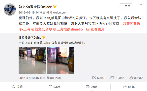 ▼這兩張照片爆紅後,認證為「上海市公安局城市軌道和公交總隊警犬支隊民警」的微博用戶「軌交K9警犬隊Officer」還開玩笑用狗狗的身分回應:「我叫Jess,就是圖中的公務汪,今天確實有點調皮了,我以後會認真工作,謝謝大家的關心!」