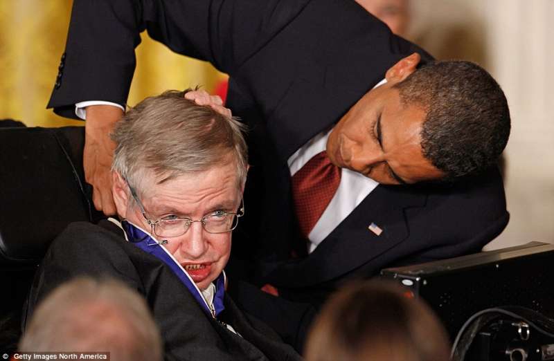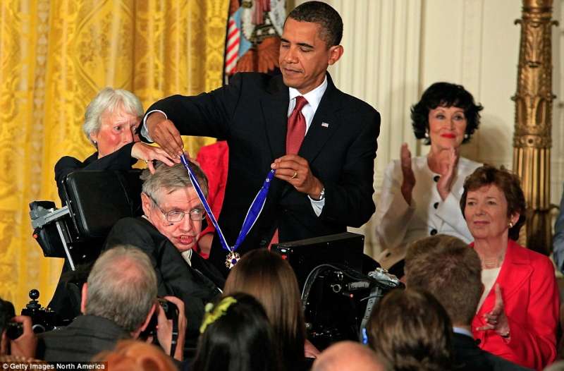 ▼2007年時,霍金在佛羅里達體驗了零重力飛行。2009年時,他因病入院治療,出院後在白宮接受歐巴馬授予的總統自由勳章。