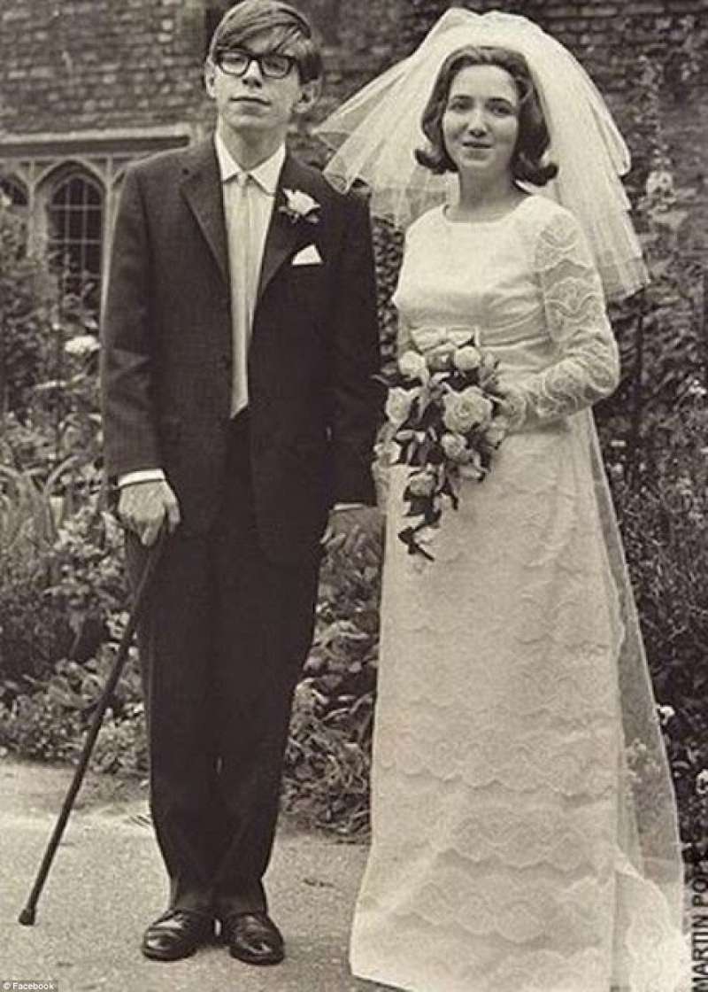 ▼1965年,霍金的病情已經很嚴重,身體變得僵硬,只能靠拐杖勉強走路。但他還是穿上西裝,和潔恩一起走進了教堂,兩人正式結婚。