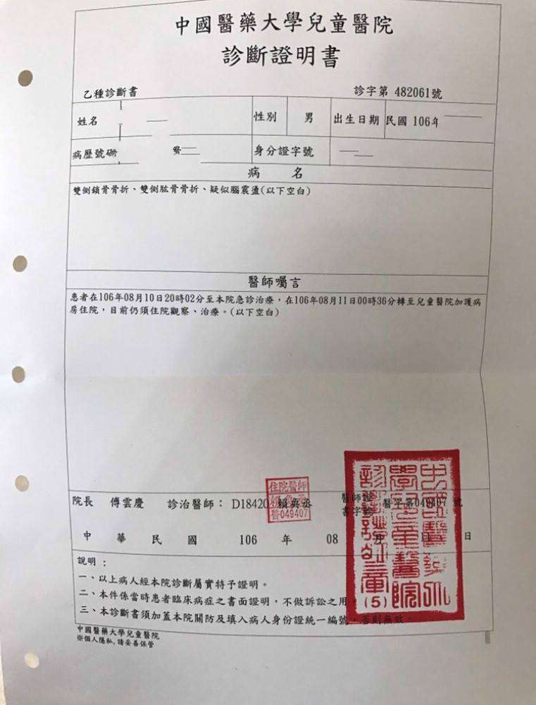 ▼直到半夜小孩不斷哭醒,他們才發現事情不對勁,趕緊送醫治療,並發現小孩身上有四處骨折和腦震盪,不久後還噴射狀嘔吐,「我們馬上又送去醫院,醫院給了我們病危通知,孩子住進了加護病房。」