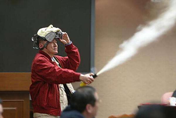 ▼為了阻止軍購案,李敖還大鬧程序委員會,在立法院拿出電擊棒和防狼噴霧器,對空狂噴催淚瓦斯,把大家嗆的眼淚直流,可以說沒人比他更狂。