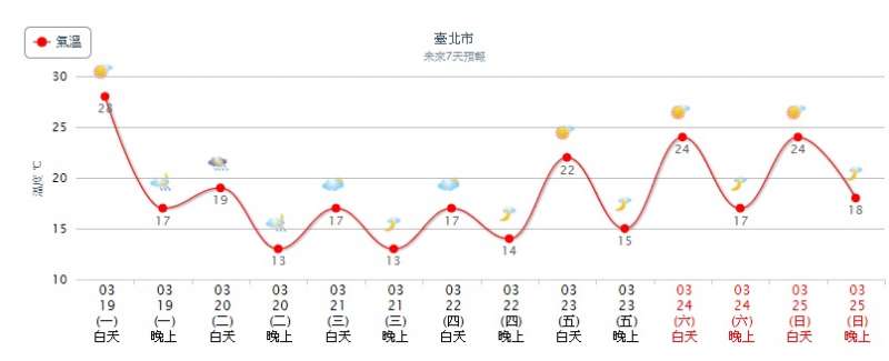 ▼氣象局預測屆時北部地區最低溫在13-14度左右、中部有機會達到13度、南部低溫15-17度、東部低溫14-16度。