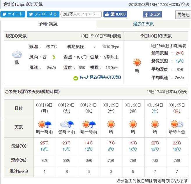 2018年03月19日最近天氣非常好,是不是非常有春天的感覺了呢?不過氣象局表示,週二(20日)將會有冷鋒過境,各地有陣雨或雷雨導致氣溫下降越晚越冷。週四(22日)受大陸冷氣團南下所影響,中部以北低溫下探11度,日本氣象協會更預估台北低溫恐「只剩8度!」