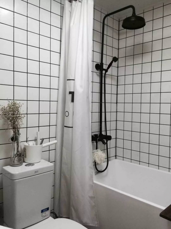 ▼曾經的重災區浴室徹底變了樣,白色磁磚與黑色線條搭配,極簡風讓人神清氣爽。浴室只有3個平方,但他們還是放了獨立的浴缸。