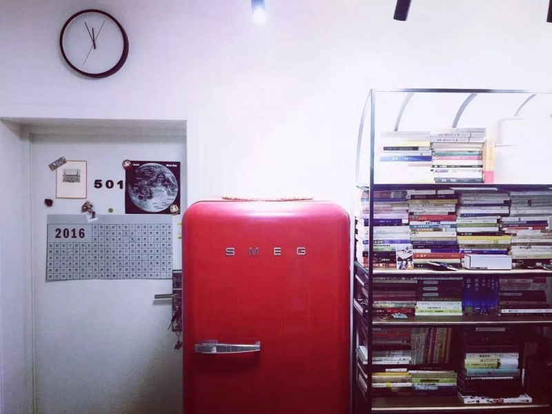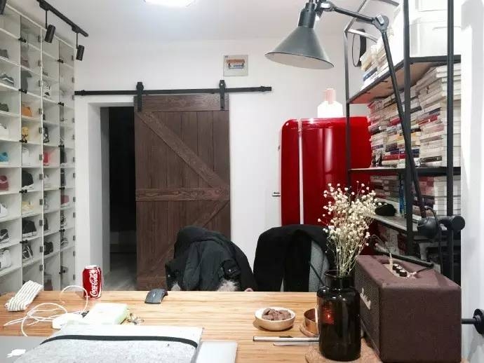 ▼鞋櫃對面則是Allen的書架、書桌,她很愛書,信奉開卷有益。書架旁邊的法拉利漆工藝冰箱是兩人的最愛,這些小細節讓房子更加溫馨。