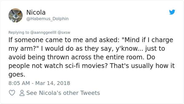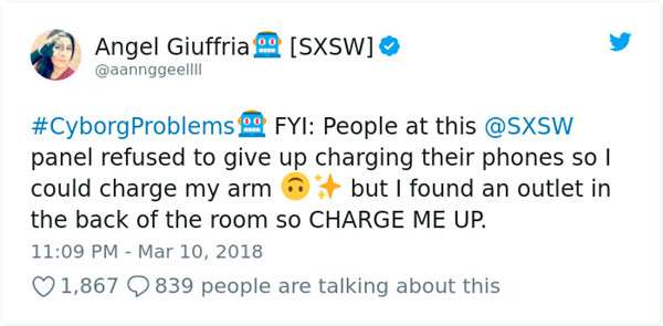 ▼最近安琪兒在推特上分享了自己的遭遇,當她在參加德州奧斯汀的SXSW(電影、交互式多媒體和音樂為主題)大會時,因為使用太久,她的機械手臂沒電了,她來到充電站,卻發現很多與會者正在給手機充電,而且拒絕讓給她地方來給手臂充電。