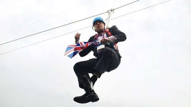 ▼被困在高空中:倫敦市長Boris Johnson為慶祝英國隊奪得首枚奧運金牌,一邊揮舞國旗,一邊玩滑索,結果滑到一半卡住,被困在半空。民眾在下方圍觀拍照,也是非常尷尬。