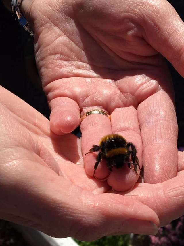 2018年03月24日去年時,蘇格蘭印威內斯(Inverness)女子Fiona Presly整理花園時,偶然發現了一隻小蟲子。她伸出手想要看清楚,那隻小蟲子竟然迷迷糊糊爬到了她的手上。她這才看清,原來那是一隻漂亮的熊蜂。