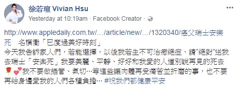 ▼原來徐若瑄之所以如此感慨,是看到台法混血名模Amanda S.的爸爸的新聞所導致。他在2017年底時癌症復發,3月初在瑞士接受安樂死,Amanda S.也透露「爸爸生前舉辦一個大派對,在瑞士安樂死一開始很難接受,了解之後就在過世前找一個好的時間,父女倆做最後旅行,講些想說的話。」