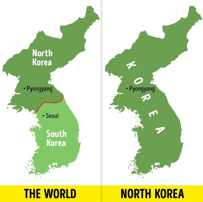 如果你把世界上任何一個國家的政治地圖拿出來,你都會看到南韓和北韓是兩個國家,但是北韓人的地圖只顯示了一個以平壤為首都的統一國家。