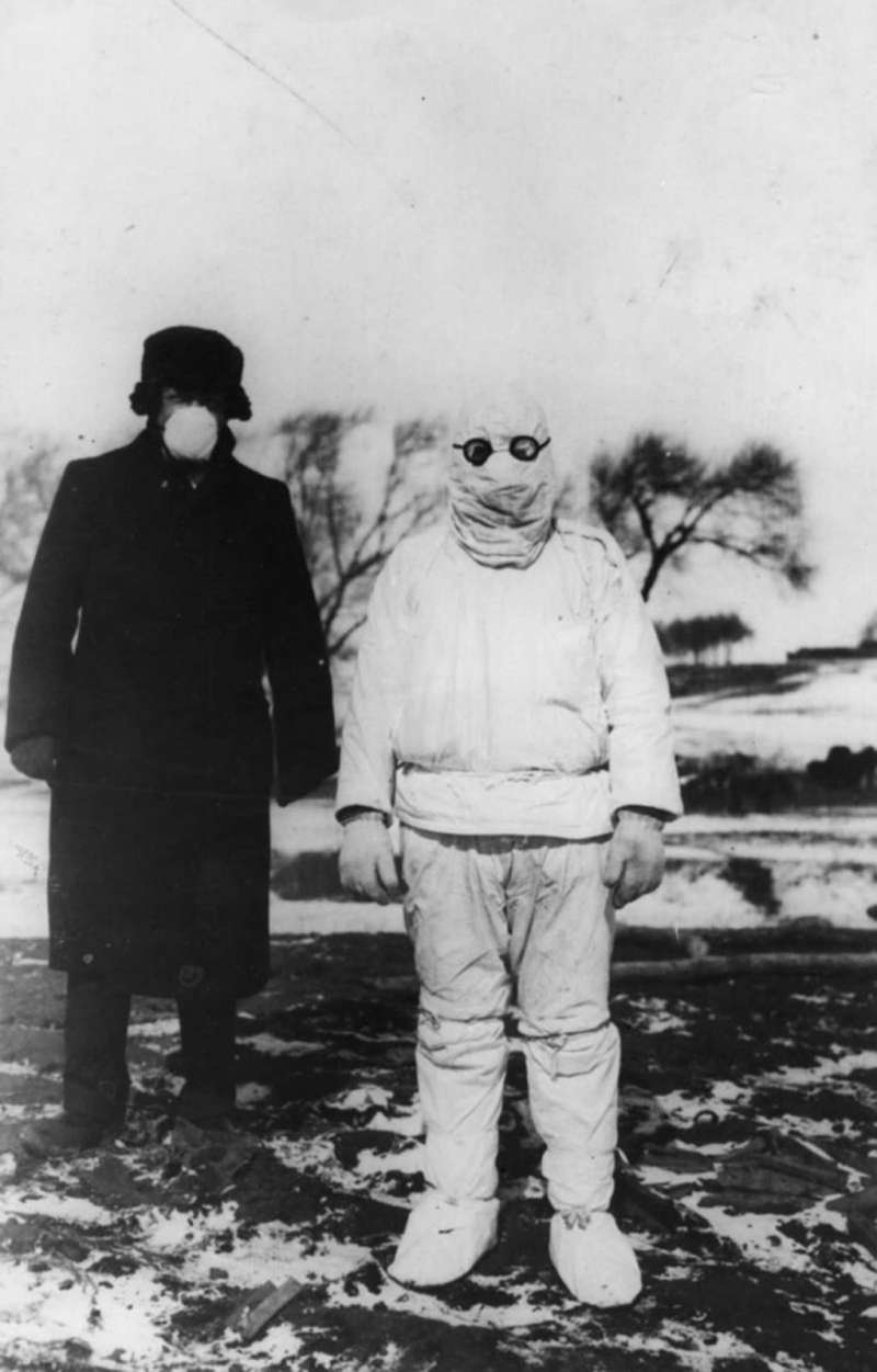 ▼​1912年,中國東北爆發鼠疫,醫生穿上了全套保護衣。