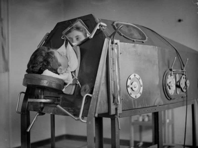 ▼​1938年,病人躺在名為「鐵肺」的人造呼吸機器中。