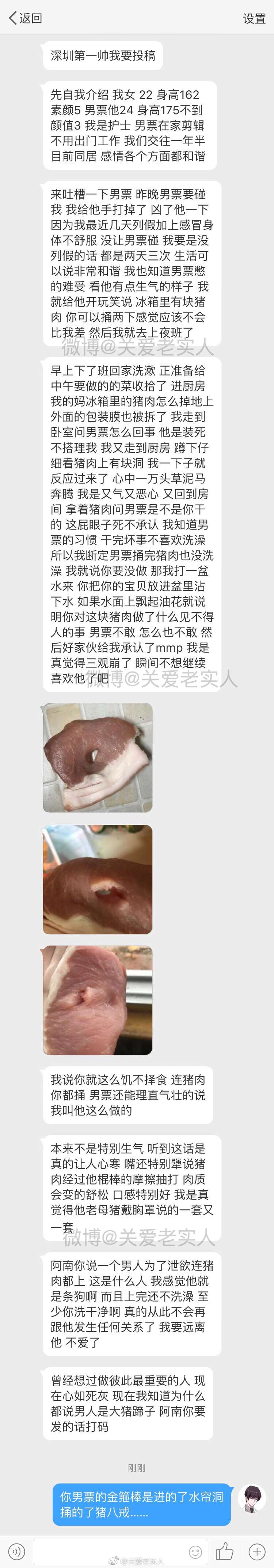 中國有一名22歲的女護理師日前在知名爆料微博「關愛老實人」中匿名投稿,指出自己在某晚因為拒絕了交往一年半的男友求歡的要求,隔天竟然發現家中的豬肉「多了一個洞」!
