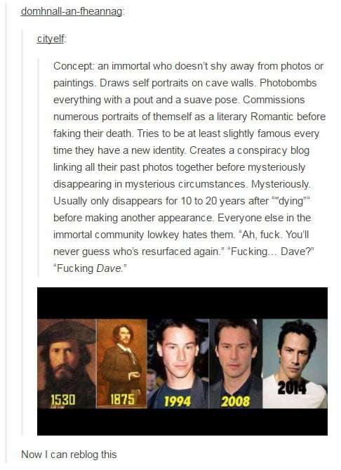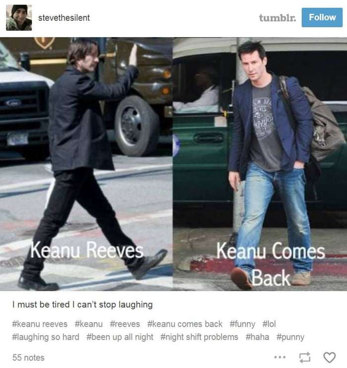 ▼基努離開(Reeves 音近 leaves),基努回來。