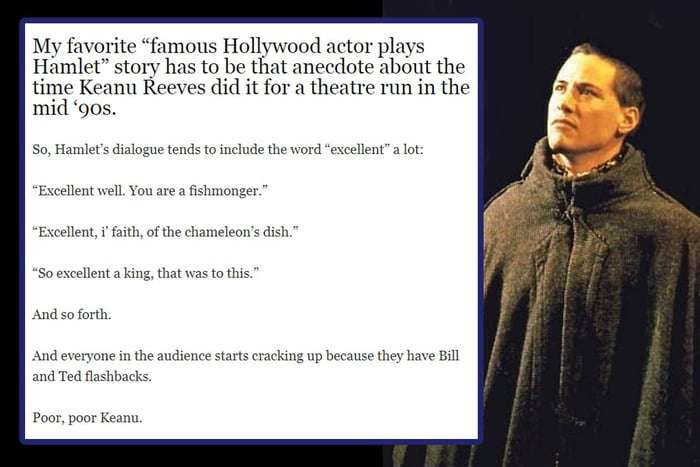 ▼基努李維成名後回到劇場演《哈姆雷特》,台詞中多次出現「好極了(excellent)」。觀眾想起他在喜劇電影《阿比和阿弟的冒險》中傻傻的表現就忍不住大笑,根本沒法專心看表演。