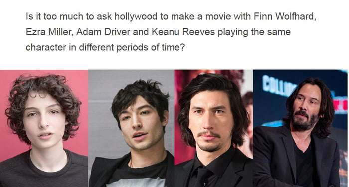▼好萊塢應該讓芬恩·沃夫哈德(Finn Wolfhard)、伊薩·米勒(Ezra Miller)、亞當·崔佛(Adam Driver)、基努李維一起拍一部電影,飾演同一個人的不同時期。