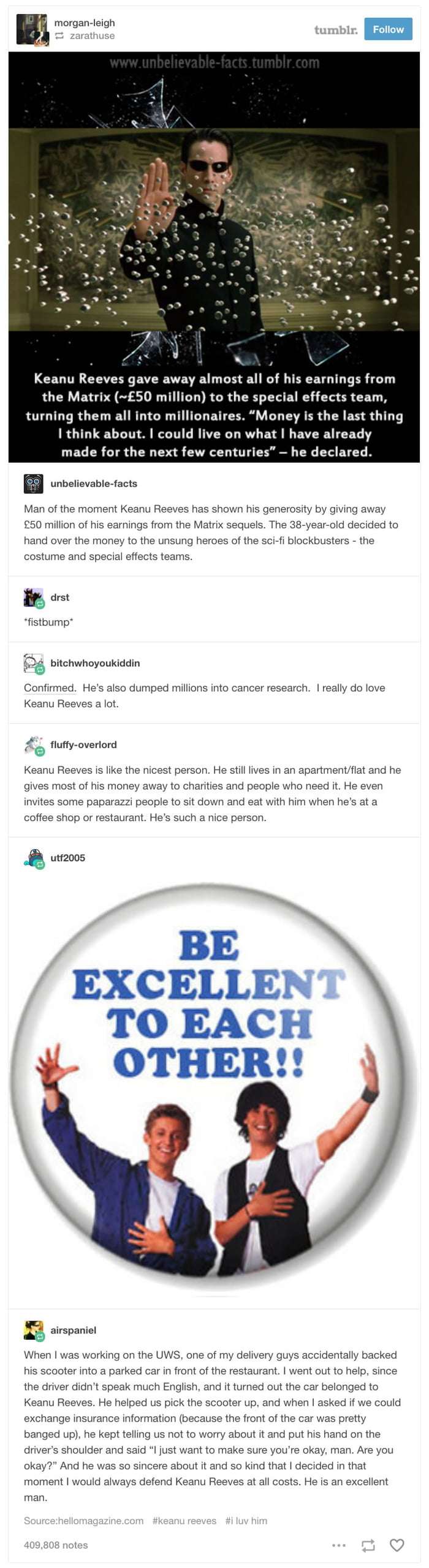 54歲加拿大男星基努李維(Keanu Reeves)被稱為「好萊塢最棒的男人」。他生活低調、工作認真、不在乎錢,還堅持做慈善。一起看看在網友們眼中,他是個什麼樣的人吧。