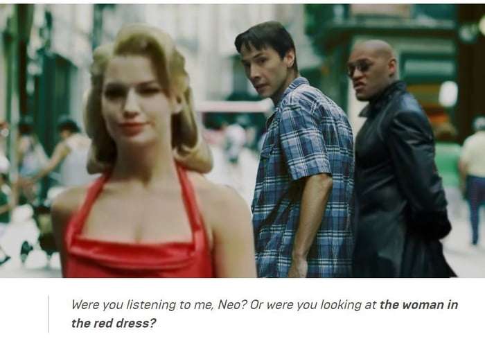 ▼「你有聽到我說的話嗎,尼歐?或者你在看那個穿紅裙子的女人?」