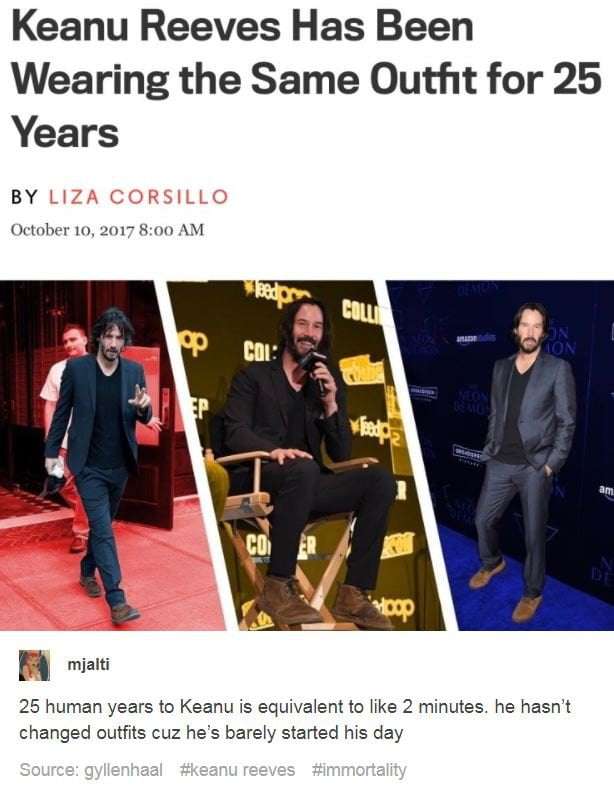 ▼人類的25年,對基努李維來說相當於2分鐘。他沒必要換外套,因為他的一天剛剛開始。