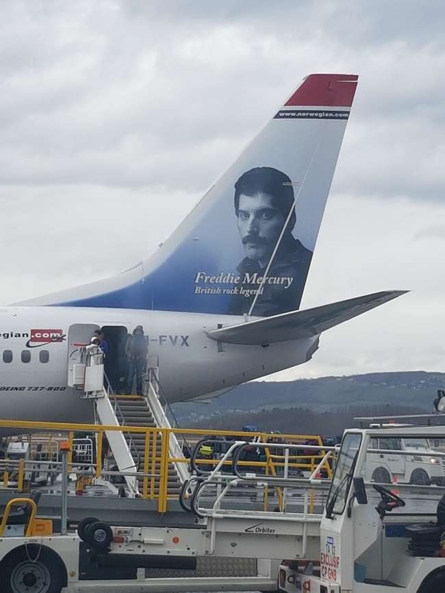 ▼挪威航空的飛機在機尾上畫了皇后合唱團主唱佛萊迪·墨裘瑞的肖像。