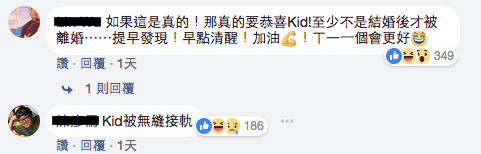 ▼雖說事情尚未定案,但網友看了緋聞消息,堅持要幫KID抱屈。他們說:「恭喜KID至少不是結婚後才被離婚」、「KID被無縫接軌」。