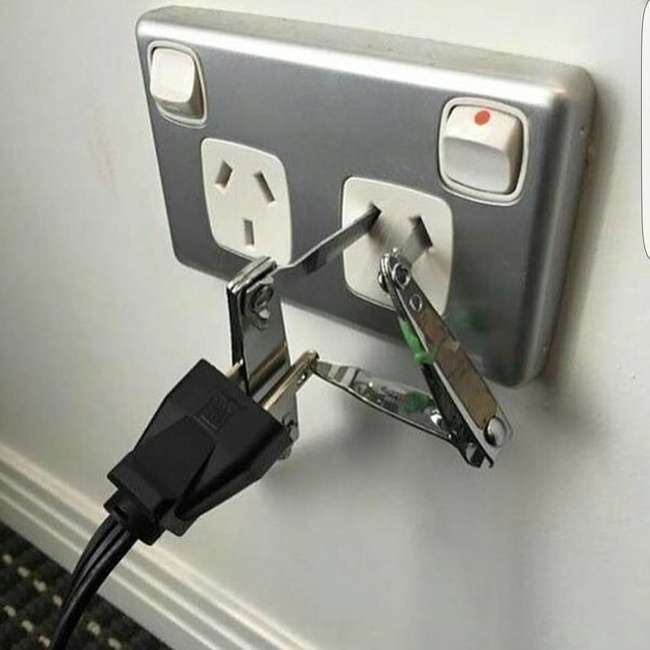 ▼當你的電源線跟插座只差一點距離的時候…(非常危險,勿學!)