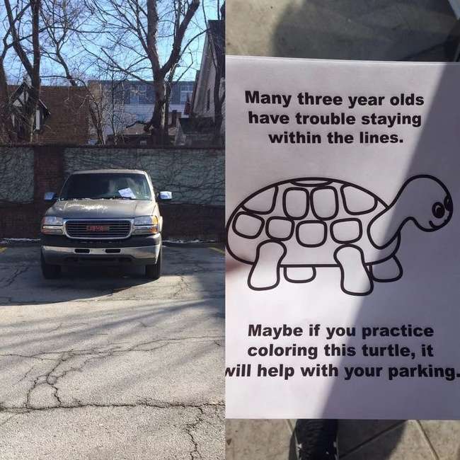 ▼有人在他的車上留下了這個:「很多3歲小孩無法待在線內,練習給烏龜上色,應該對你的停車技術有幫助。」