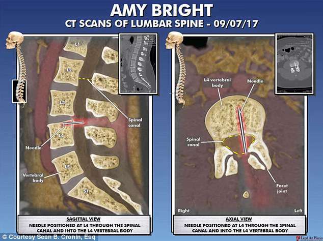 ▼Amy表示:「我的尾椎骨旁邊像火燒一樣,有時候還會導致左小腿疼痛,疼痛會蔓延到我的腳上。」她和律師聲稱,醫院知道針頭斷掉,卻沒有採取任何措施,如果早點將針頭取出來,傷害會小很多。現在做手術取出針頭的話,Amy會永遠癱瘓,不取出來的話後果也是一樣的。