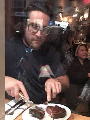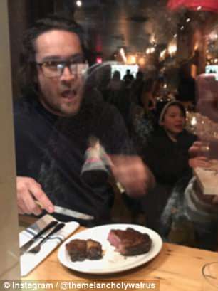 ▼週五晚上,抗議活動仍在進行,Michael直接拿著一段鹿腿來到玻璃櫥窗前,當著抗議者的面割鹿肉,極盡挑釁之能事。他還將肉帶到廚房烹煮,又坐到窗前的座位上大快朵頤。