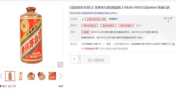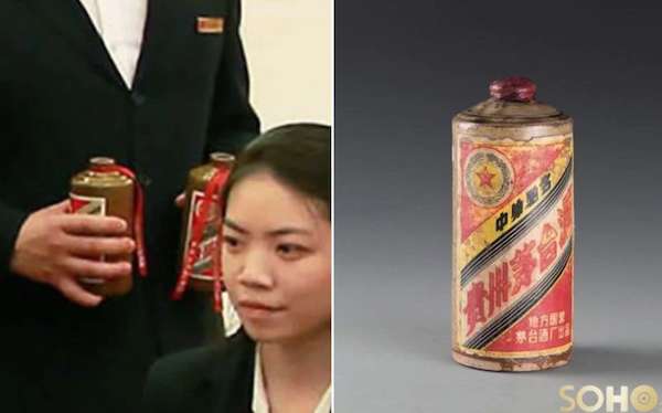 ▼這瓶酒雖然外觀普通,卻是上世紀60至80年代少量出產的「矮嘴醬瓶茅台」,向來被作為專供,一瓶就要價590萬台幣,成交價比其他茅台都高。由於媒體捕捉到酒侍拿了兩瓶茅台酒,代表當晚的酒錢至少花了1180萬台幣!