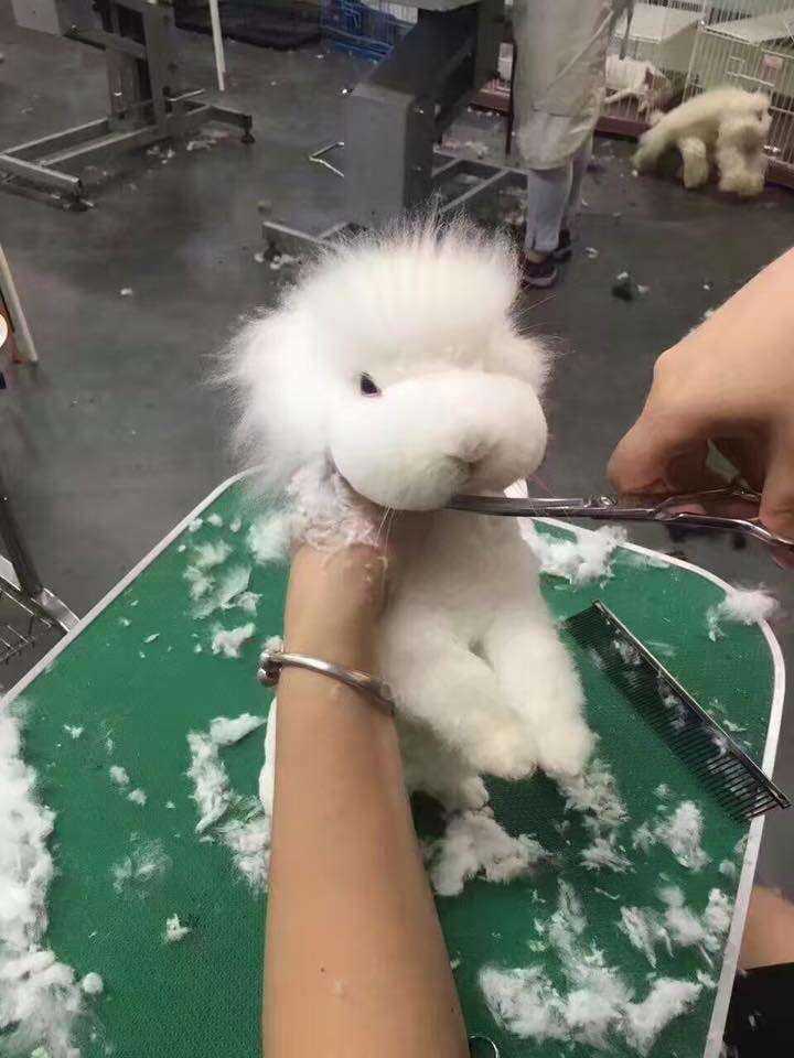 ▼小兔子乖乖的讓設計師剪毛,一點也不反抗,不過怎麼越看越奇怪…這隻被改造的毛小孩還是隻兔子嗎?