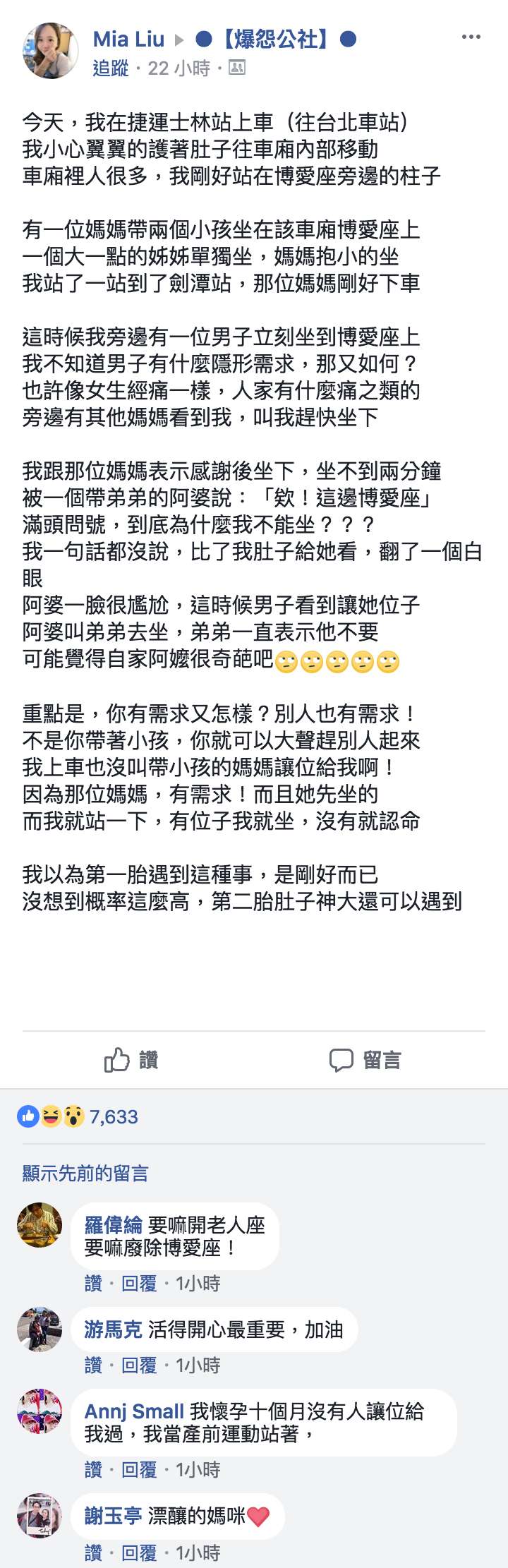 ▼這位孕婦在「爆怨公社」表示,自己當時在士林搭捷運,一上車就護著肚子往內車廂移動。本來博愛座有一位媽媽帶兩位小孩坐著,但後來對方下車,一位男子立刻坐到其中一個位置上,「旁邊有其他媽媽看到我,叫我趕快坐下。」