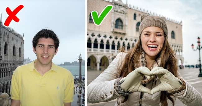 ▼1.在建築前或在綠地上拍照時,人物應該是照片的焦點,風景只是背景而已。你也可以主要拍建築,把人當成一個小剪影。忽略這一點的話,照片就會很糟糕,人物像是P進去的一樣。