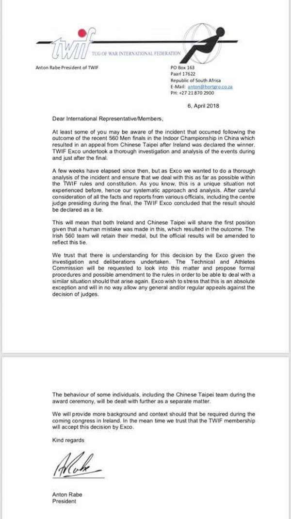 ▼拔河世界總會則在數週後表示,由於過去沒有經歷過這種狀況,所以他們小心查證,檢定多位裁判提出的報告後,裁定確實有人為疏失,所以判兩隊平手。中華隊可以補拿回金牌,而愛爾蘭隊也能保有他們的獎牌。
