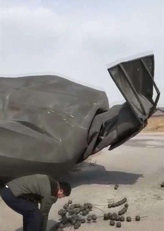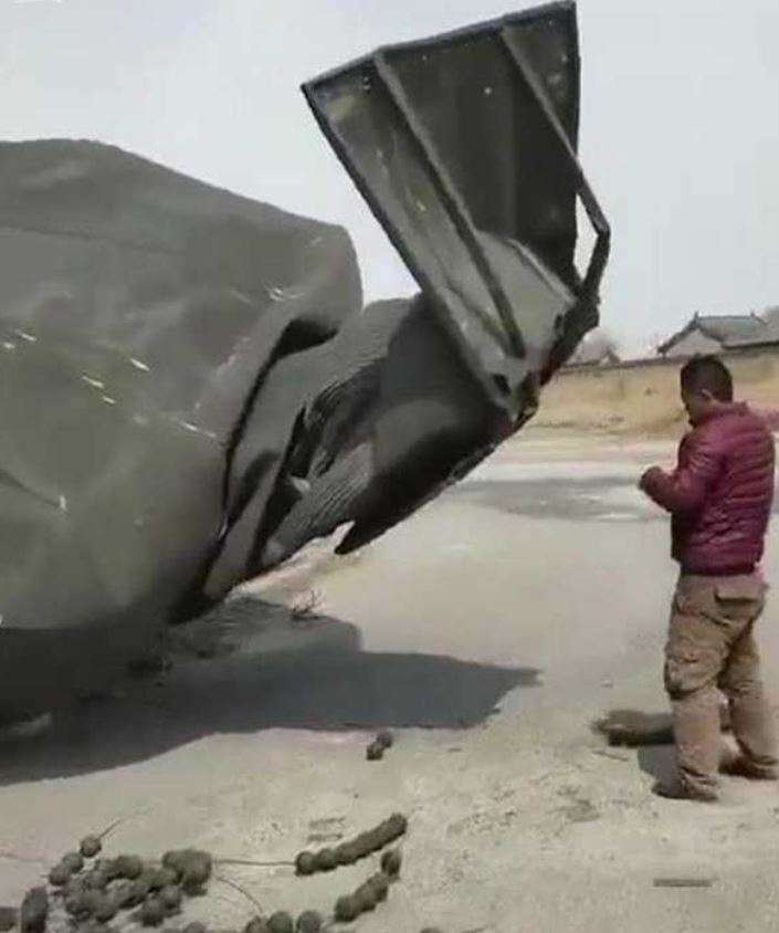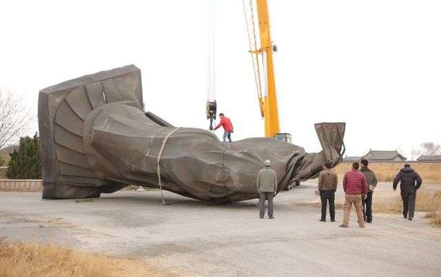 ▼也由於銅像實在太大,「當地工作人員都束手無策」,銅像臉部嚴重毀損,完全扁平,最後工作人員只能用拖車將殘骸拖走。