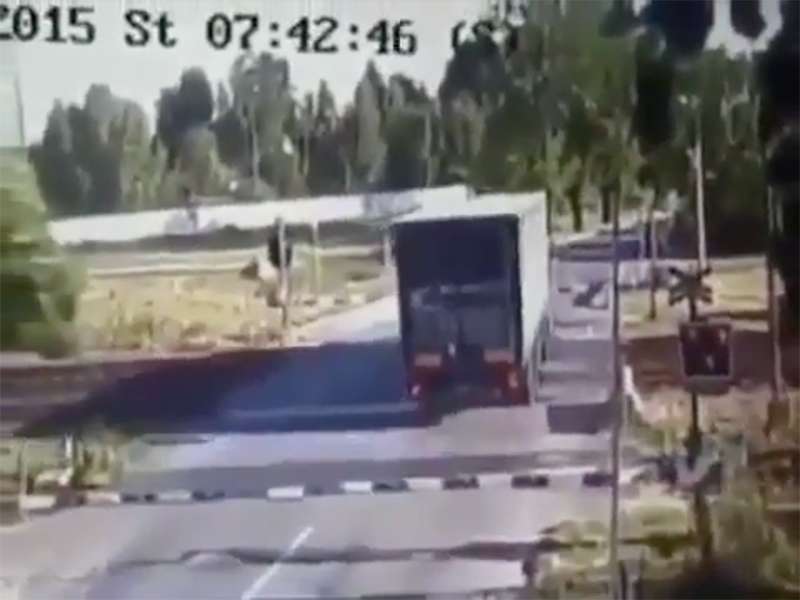 ▼以下這段影片中,這位貨櫃車司機就因為搶快行駛到平交道上,被降下的欄杆擋住,這時一輛高速列車急駛而過!
