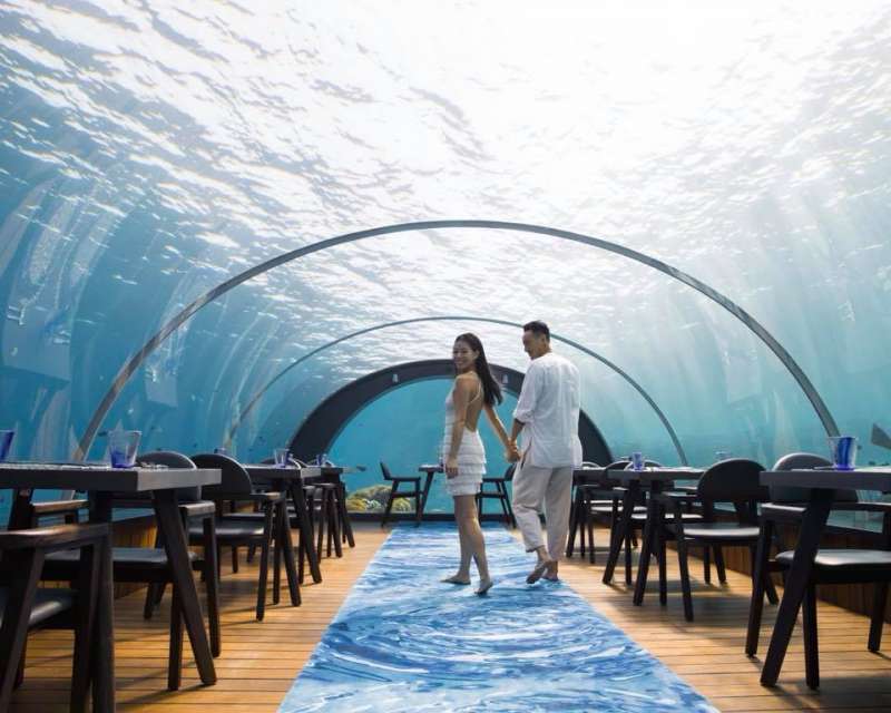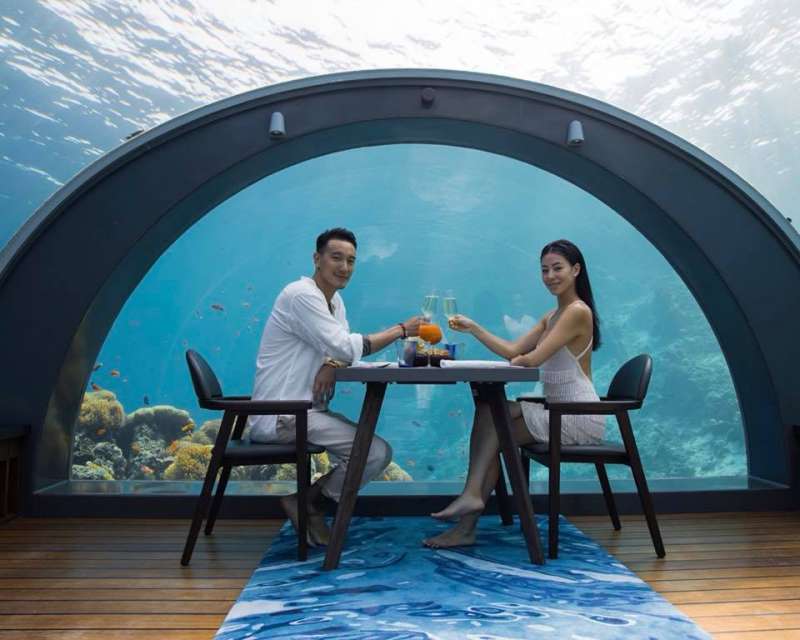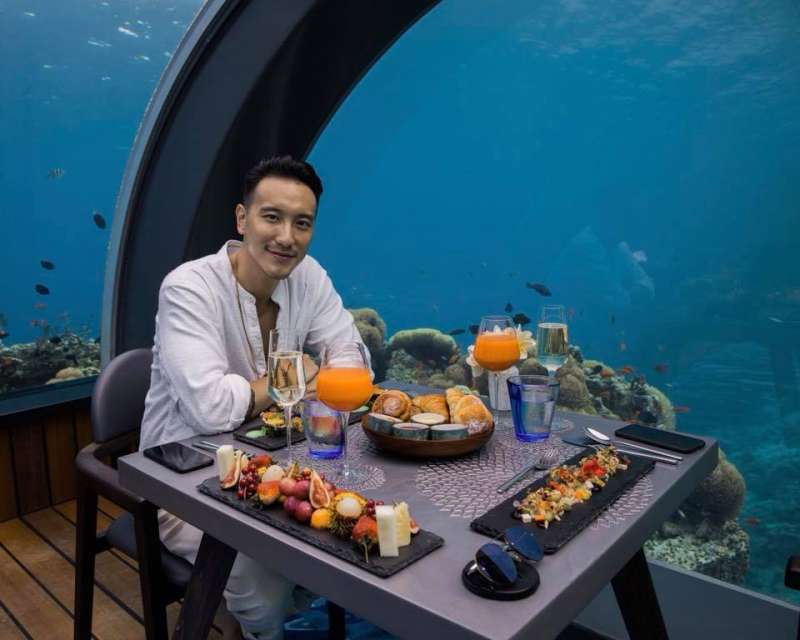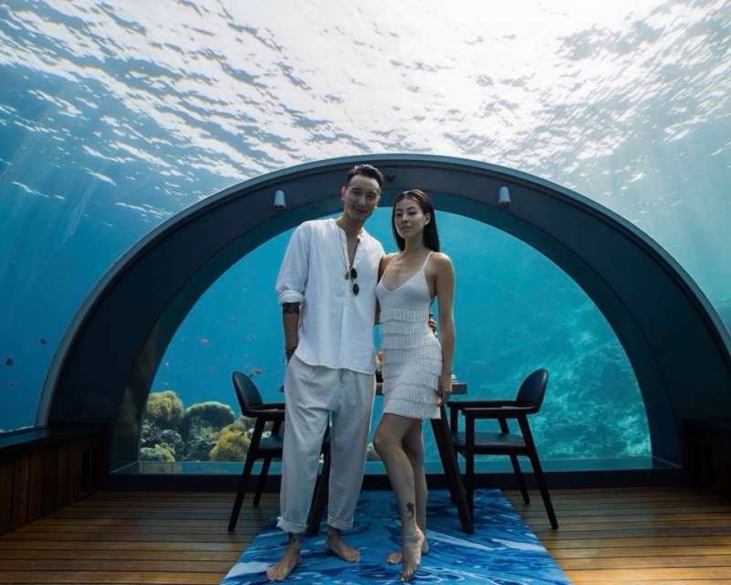 ▼王陽明在愛妻生日這天,帶她來到馬爾地夫的海底餐廳,蔡詩芸身穿白色低胸露背洋裝,好身材顯露無疑。今天這裡是兩個人的專屬空間,四周環繞著海洋景觀,兩人一邊享受美食,一邊欣賞美景,好不浪漫。
