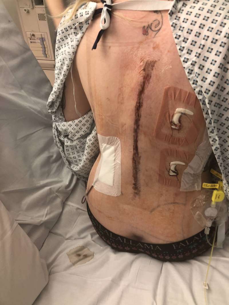 ▼從這名女網友@PenutButterVibes所分享的照片可以看到,她剛剛進行了「脊椎階段性後路矯正手術」的照片,除了中央有一條超長超粗的疤痕之外,背部右邊還有兩根支架從皮膚內往外「鎖」在皮膚表面,左下角腎臟的部位還有一根導管在疏導多餘的淤血。