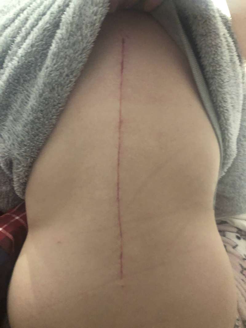 ▼事後她也分享了自己在手術一個月的照片,可以看到傷口復原得很好,可是還是留下了一條又長又顯眼的疤痕,令人觸目驚心。