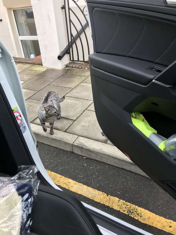 2018年04月12日貓咪永遠會做出讓你意想不到的事,英國一位網友丹尼爾(Daniel Sherlock)本來要開車出門辦事,卻在離家不遠處發現偷偷「逃家」的愛貓,而愛貓被他抓包的心虛表情立刻在網上紅了!
