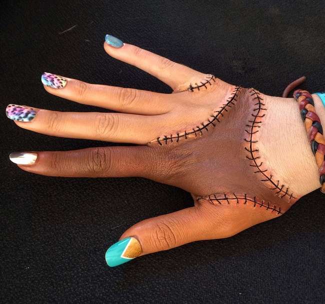 ▼特效化妝師將手變成了不同膚色拼接成的模樣。