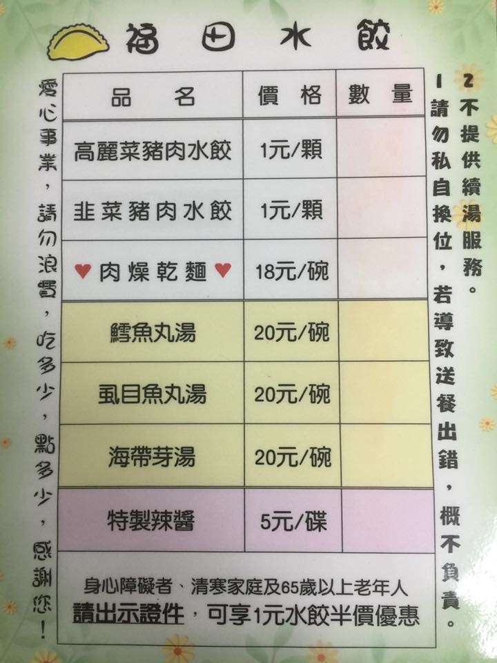 這家位於高雄左營的「高雄福田水餃」,店內乾淨簡潔,充滿溫馨感,仔細一看菜單價錢,店內一顆水餃竟只要一塊錢,若是弱勢族群或65歲以上的老人家再打五折,等於兩顆水餃只要一塊錢。